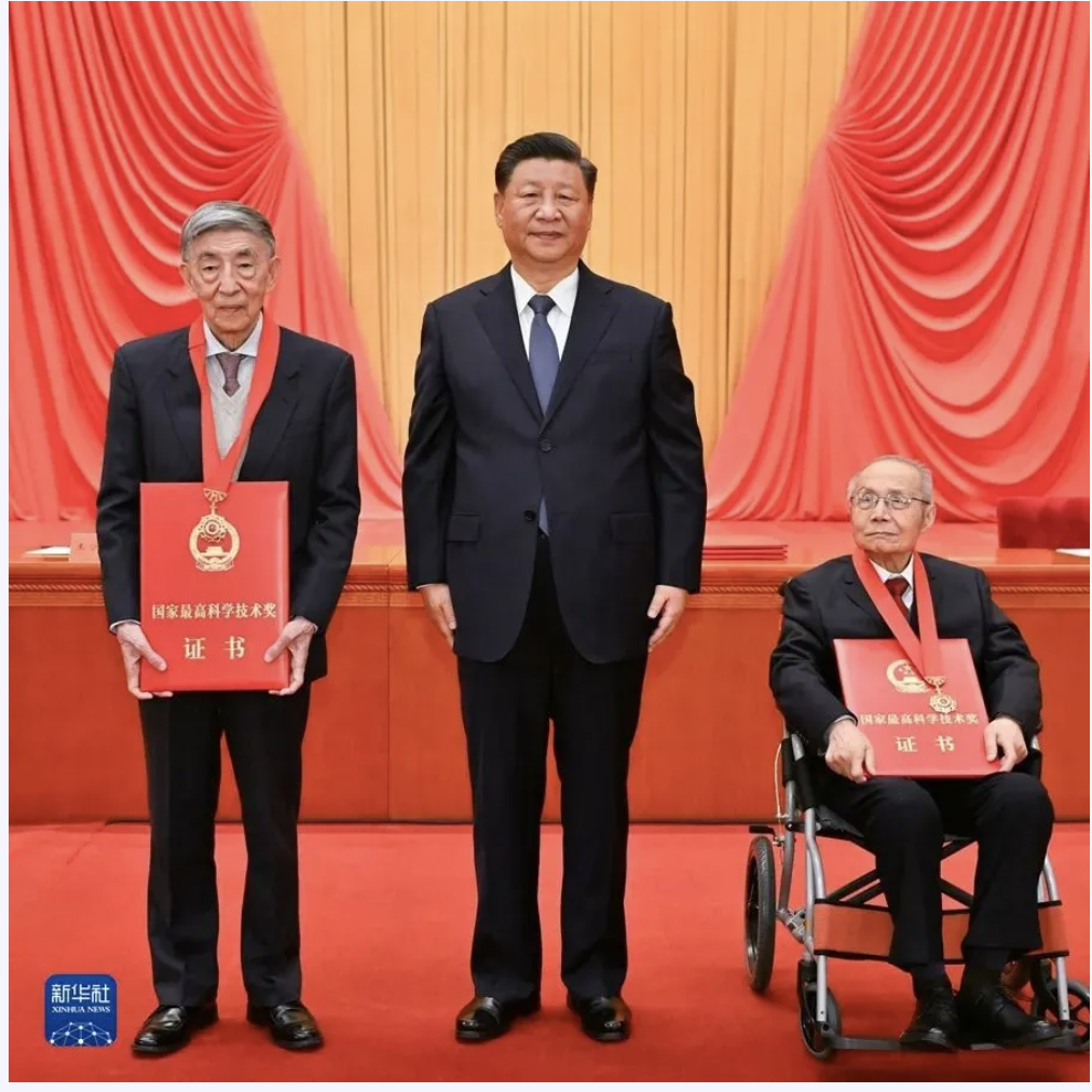 习近平向获得2020年度国家最高科学技术奖的中国航空工业集团有限公司顾诵芬院士(右)和清华大学王大中院士(左)颁奖。新华社记者 李学仁 摄